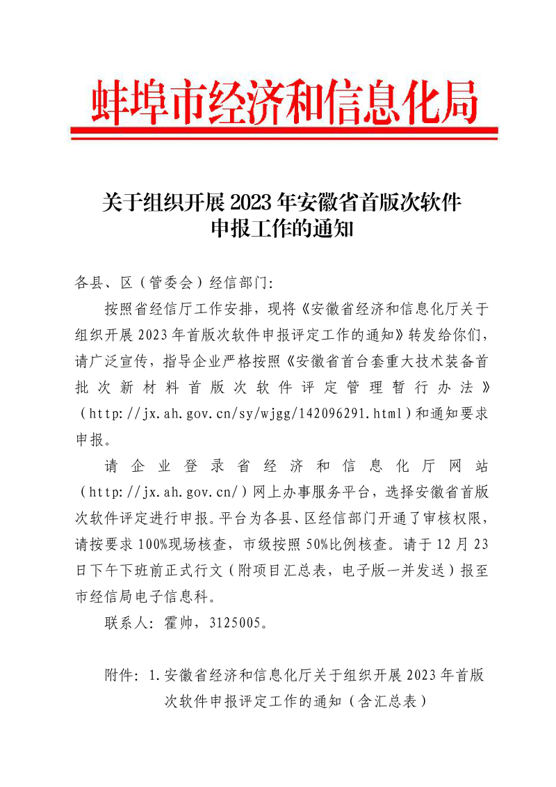 关于组织开展2023年安徽省首版次软件申报工作的通知
