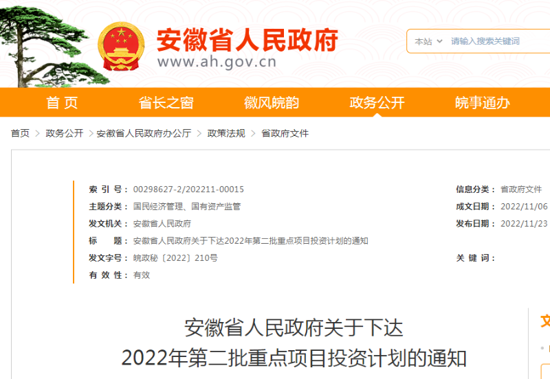 安徽省2022年第二批重点项目投资计划