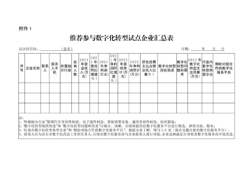 为做好试点企业遴选工作,请各县区围绕上述行业,优先选择数字化转型需求迫切、发展潜力巨大、经济社会效益明显的中小企业积极申报试点(已获中央财政资金支持的专精特新“小巨人”企业不再纳入试点范围),并组织企业填写报送《推荐参与 数字化转型试点企业汇总表》(见附件1),于9月2日(星期