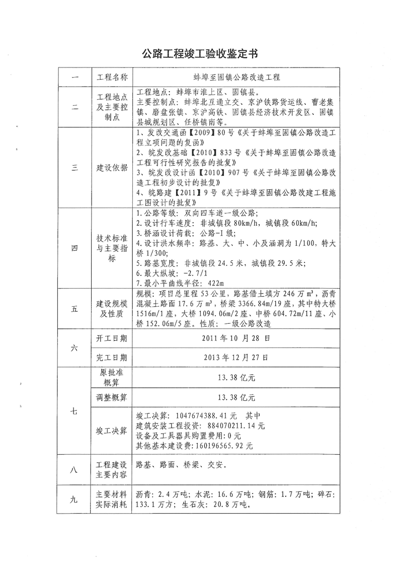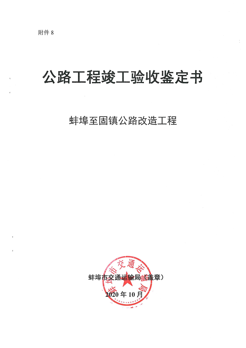 重大项目蚌埠至固镇公路改造工程竣工验收鉴书 |
