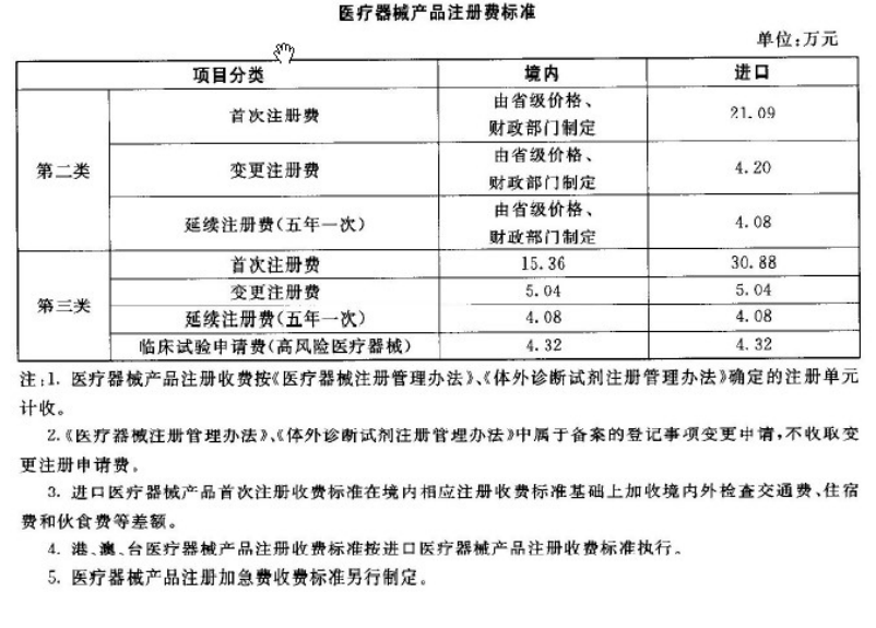 国务院食品药品监督管理部门和省级食品药品监督管理部门依照法定职责,对第二类、第三类医疗器械产品首次注册、变更注册、延续注册申请以及第三类高风险医疗器械临床试验申请开展行政受理、质量管理体系核查、技术审评等注册工作,并按标准收取有关费用。具体收费标准如下: