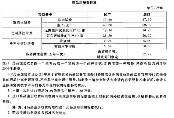 国务院食品药品监督管理部门和省级食品药品监督管理部门依照法定职责,对新药临床试验申请、生产申请、仿制药申请、补充申请和再注册申请开展行政受理、现场检查/核查、技术审评等注册工作,并按标准收取有关费用。具体收费标准如下: