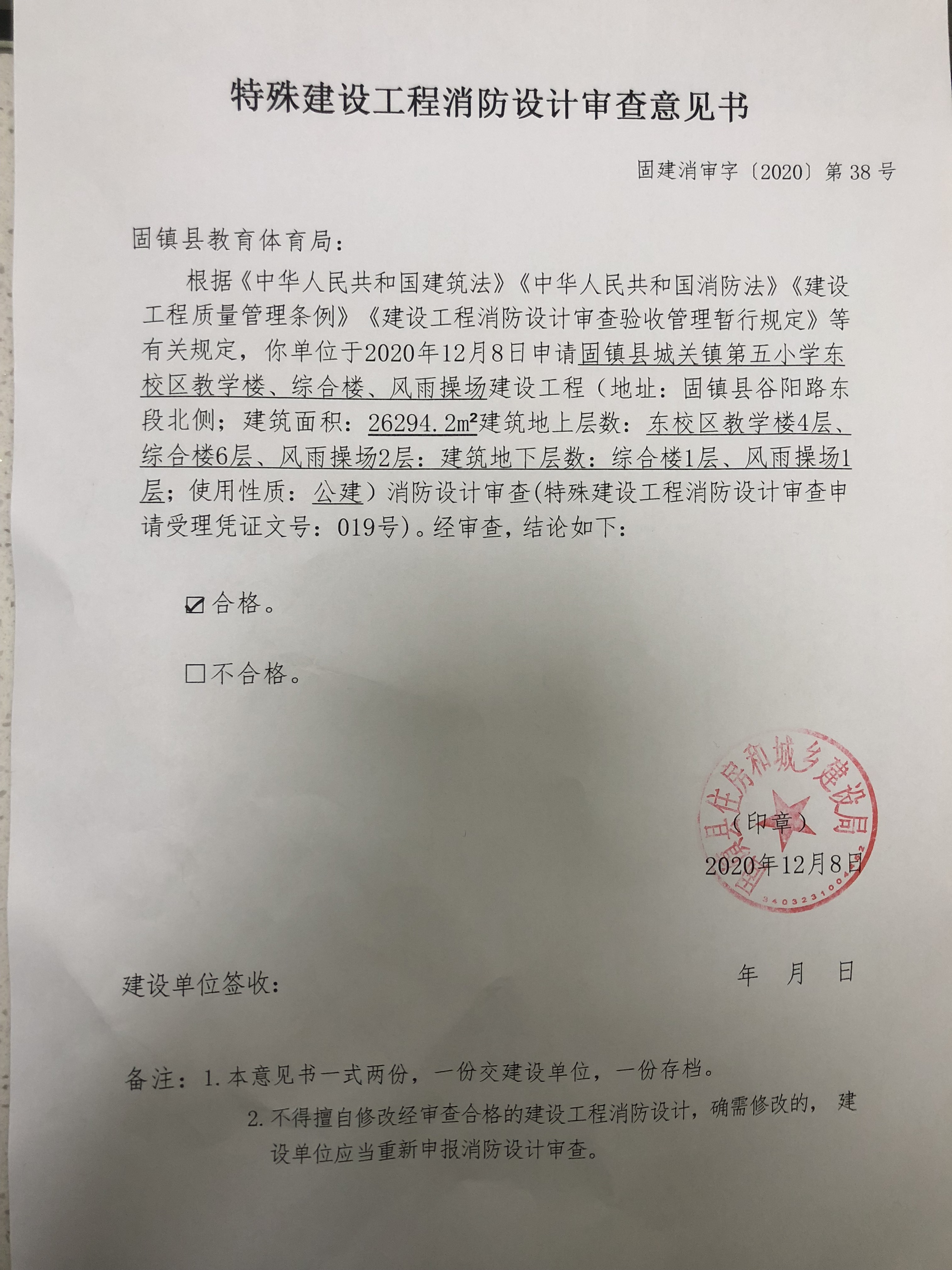 【批准信息】固镇县第五小学东校区消防设计审核备案