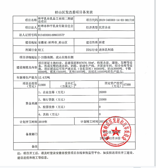 【批准结果信息】和平乳业乳品工业园二期建设项目备案